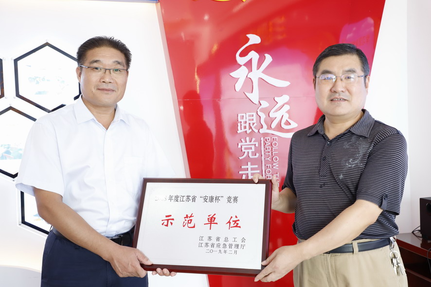 調研期間,陳健為集團公司榮獲“2018年度江蘇省‘安康杯’競賽示范單位”授牌,還為祝星星“勞模創(chuàng )新工作室”授牌。