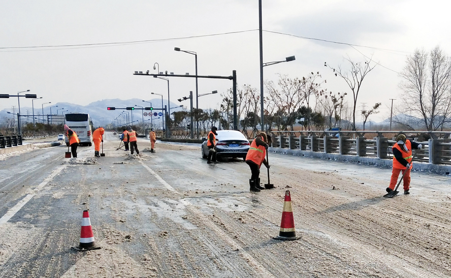 裕升、裕欣、裕祥三家養護公司組織綠化、保潔人員配合除雪車(chē)、裝載機等機械設備對花果山大道、黃海大道、東方大道、242省道、新光路及大浦路等主干道進(jìn)行清雪作業(yè);對程圩橋、先鋒大橋等橋面易積雪路段以及馬山路立交、新光路涵洞等“上跨下穿”路段采用撒氯化鈣的方式,加速積雪融化,并安排人員及時(shí)掃除積雪,防止路面因低溫降雪產(chǎn)生冰凍,對交通安全造成影響;對創(chuàng )智綠園廣場(chǎng)、火車(chē)站廣場(chǎng)及匝道等窗口地段采用人機結合的形式清掃積雪。盛達市政公司、瑞泰服務(wù)公司及益豐園林公司在提供鏟車(chē)、平板車(chē)、裝載機等機械車(chē)輛配合掃雪的同時(shí),積極做好后勤服務(wù),為清雪工作有序開(kāi)展提供保障。截至到中午,各條主干道積雪已基本清理完畢,道路恢復暢通,保障居民出行和交通安全。