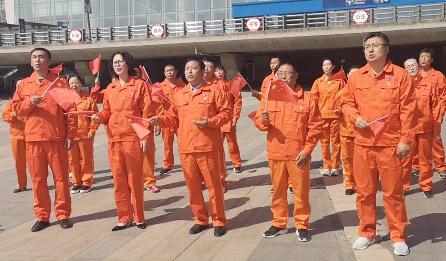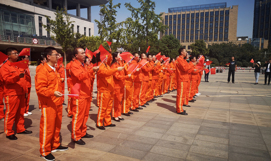 活動(dòng)現場(chǎng),身著(zhù)亮橙色工作服的華茂員工,人手一面紅旗,不少青年員工在臉上身上貼上各式小紅旗,眾多圍觀(guān)群眾和往來(lái)旅客紛紛被氣氛感染自發(fā)加入宣傳隊伍,共同唱起《我和我的祖國》,大家臉上洋溢的不只是自豪,更是努力干事創(chuàng )業(yè)的動(dòng)力。