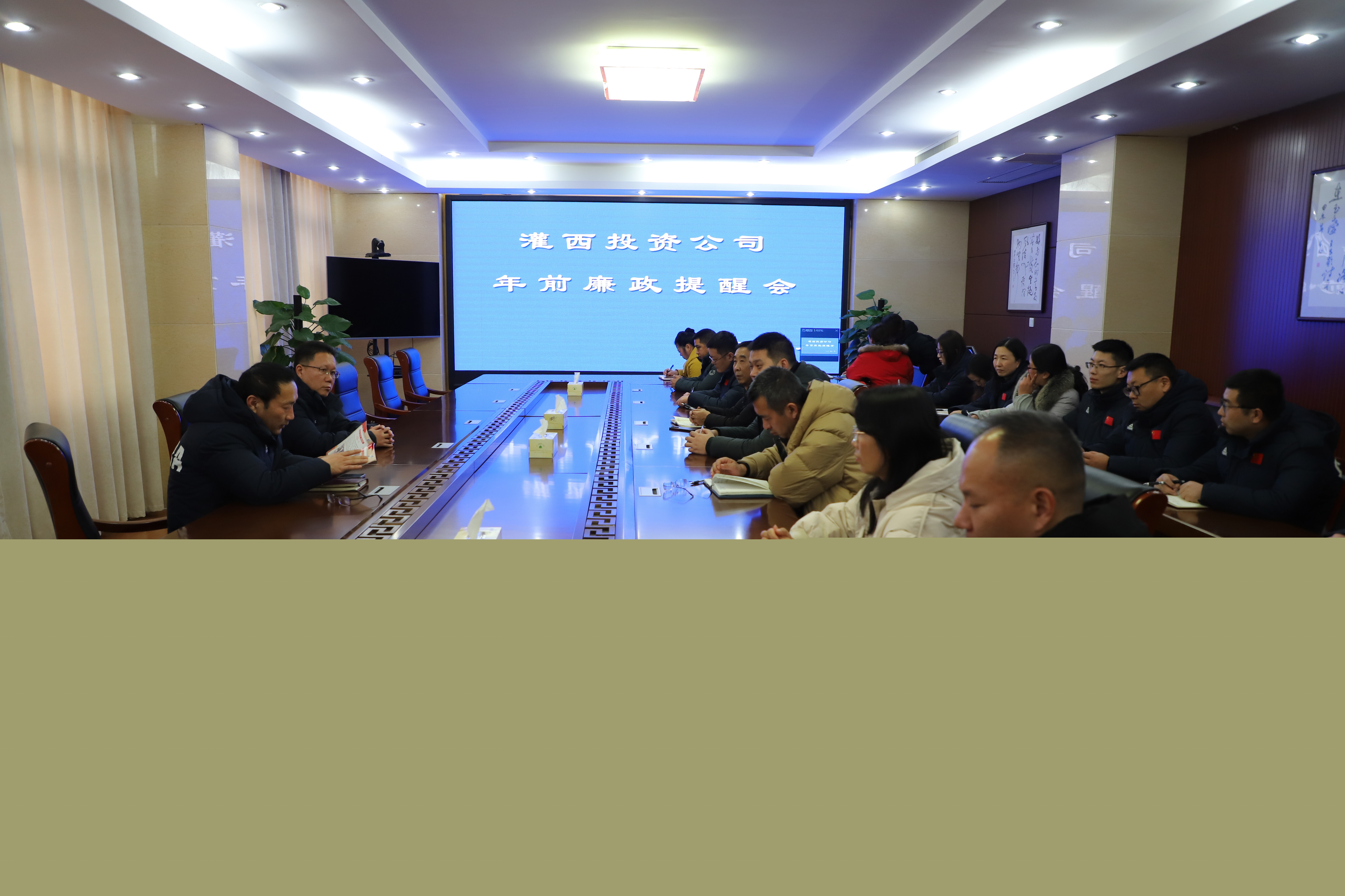新春佳節將至,為加固中央八項規定堤壩,持續釋放從嚴信號,營(yíng)造風(fēng)清氣正節日氛圍,2月4日,灌西投資公司紀委組織召開(kāi)年前廉政提醒會(huì ),灌西公司紀委書(shū)記王克平出席會(huì )議,公司紀委副書(shū)記張建保主持會(huì )議,部門(mén)負責人及關(guān)鍵崗位人員參加會(huì )議。