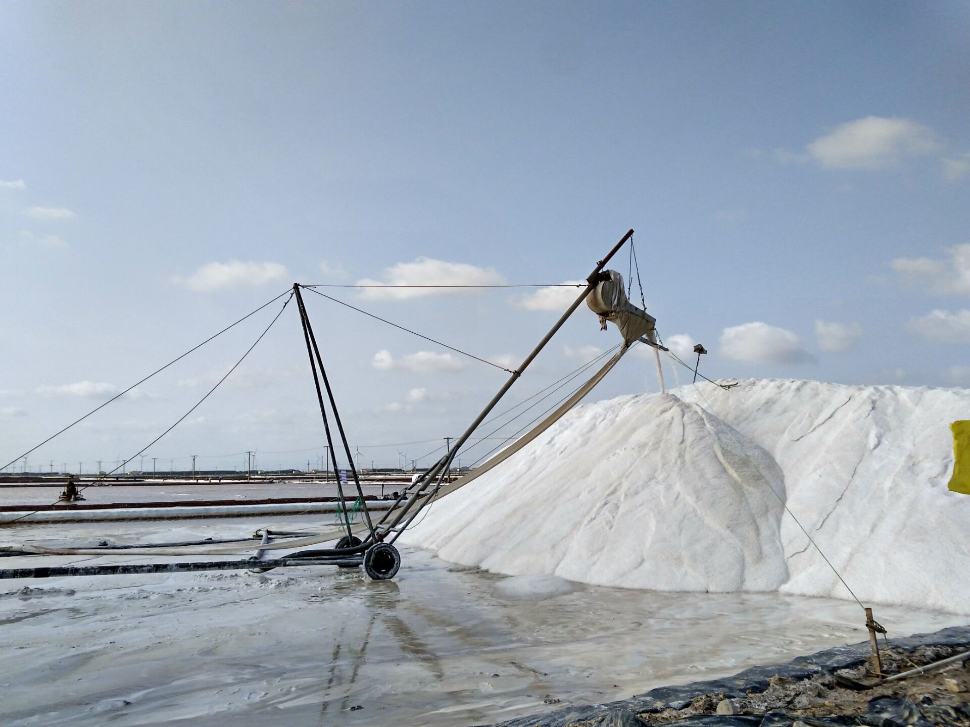 10月6日,在日曬制鹽新河分公司十班,幾名鹽工在不遠處鹽池內整理扒過(guò)鹽的格塊,一臺唐三零機械正在最后一塊鹽池內緩緩移動(dòng)集鹽,鹽泵運轉不停,輸送鹽上廩,一條鹽廩即將筑成。在國慶假日期間,日曬制鹽公司值班人員不脫崗、生產(chǎn)經(jīng)營(yíng)不斷線(xiàn)、鹽業(yè)生產(chǎn)不停歇,入秋以來(lái),已扒鹽5萬(wàn)噸,為公司的國慶假日增添了道道靚麗的風(fēng)景。