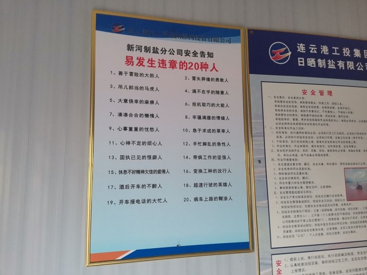 4月25日,新河制鹽分公司對16個(gè)產(chǎn)鹽班組安全活動(dòng)室加裝安全告知牌,這是該公司防范人為因素造成安全事故,確保安全生產(chǎn)形勢穩定采取的措施之一。
