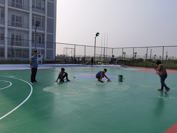 灌西籃球場(chǎng)總面積約510平米,附屬球場(chǎng)地面600平米,外圍護欄高3米。項目圍繞關(guān)鍵節點(diǎn)及重難點(diǎn),強化施工組織,統籌施工進(jìn)展?;@球場(chǎng)地面露天暴曬,溫度極高,仿佛蒸籠一般。施工人員在進(jìn)行鑿地、涂漆時(shí),僅幾分鐘的功夫,衣服從里到外被汗水浸濕,隨時(shí)有中暑的可能性,項目組把責任明確到個(gè)人,開(kāi)展班前安全教育活動(dòng),保證施工安全。施工單位南翼工程公司負責人錢(qián)明偉克服人員緊缺,工期緊迫等問(wèn)題,頂著(zhù)高溫,始終奮戰在工程項目第一線(xiàn)。