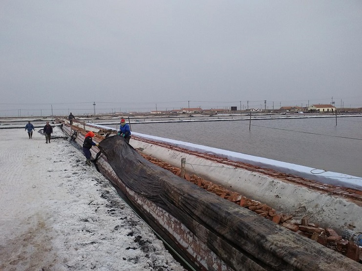 新河制鹽分公司為了盡快改善食用鹽基地面貌,減少池埝上固化紅磚風(fēng)化,沙塵落入鹽池內,對池鹽的污染,近期組織分公司職工,對基地塑池的紅磚固化池埝進(jìn)行處理,先用黑塑布把池埝重包一遍,然后再用土工布苫好。有效地減少了雜物落入池鹽中,為產(chǎn)合格食用鹽提供了良好生產(chǎn)環(huán)境。(圖為職工們正在苫蓋紅磚固化池埝。)