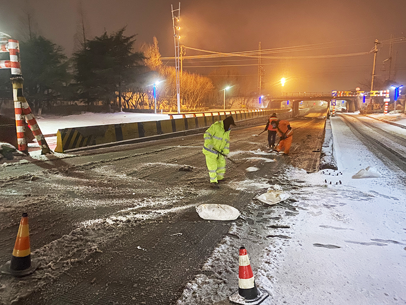 ? ? 此次掃雪除冰行動(dòng),采用人機結合方式,調派鏟雪車(chē)、裝載機等機械設備,對東方大道、黃海大道、花果山大道、242省道等主要干道人行便道、交叉路口,新海連大廈、火車(chē)站東站等重要地段的路面冰雪進(jìn)行突擊清理;對各條干道的橋面及馬山立交橋、新光路下穿立交等坡度路面鋪灑氯化鈣除雪劑融化冰雪。