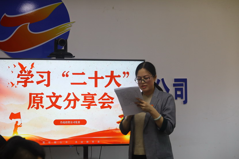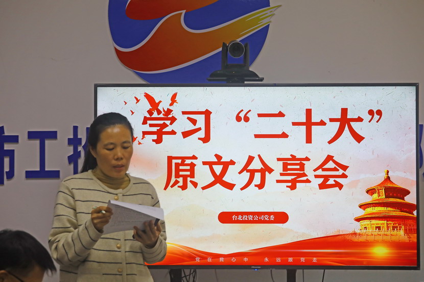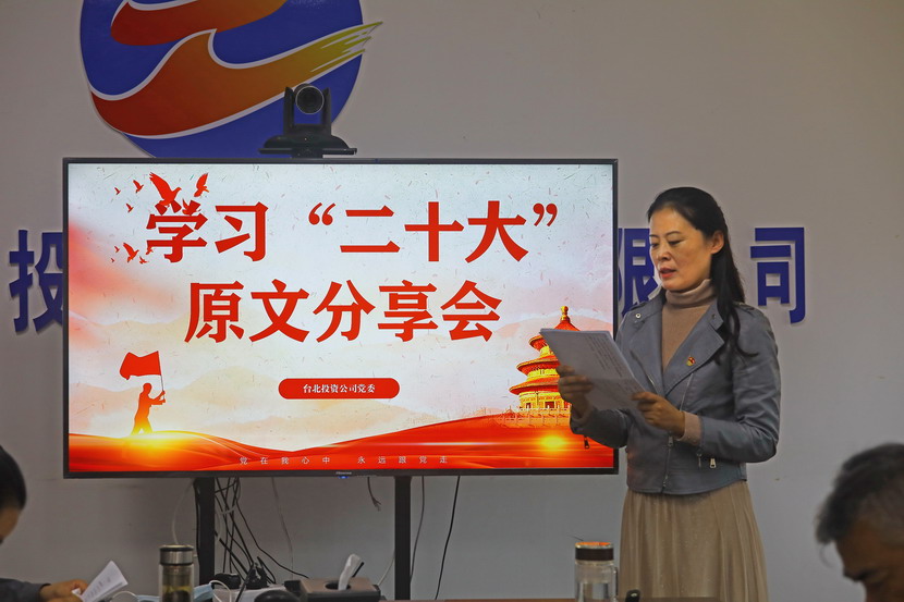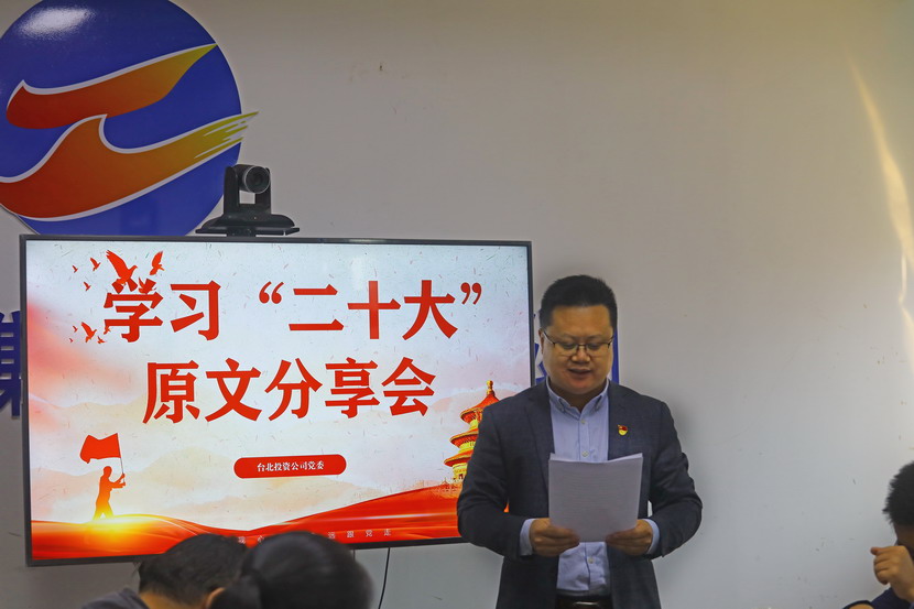 10月21日,臺北投資公司黨委組織召開(kāi)黨的二十大報告學(xué)習交流會(huì ),每位同志閱讀報告原文,針對報告內容結合工作實(shí)際,分享心得體會(huì )、暢談工作思路、謀劃未來(lái)發(fā)展。
