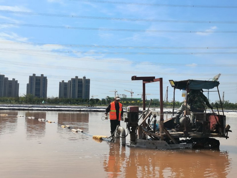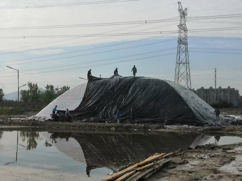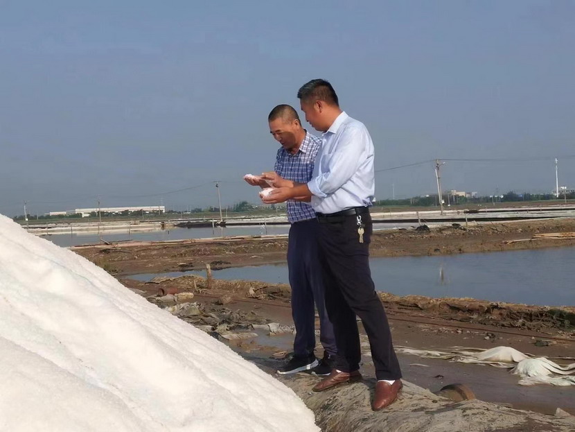 第一片180公畝的曬鹽池已經(jīng)收鹽完畢,工人師傅們嫻熟有序用塑布對鹽廩進(jìn)行覆蓋,預防雨水造成鹽斤淌化。