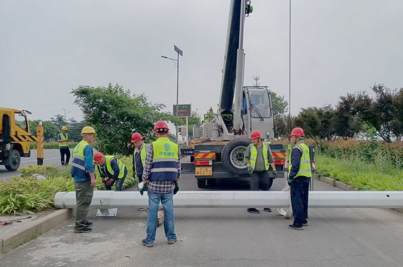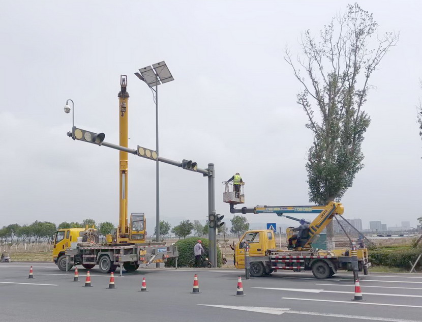 隨后,筆者一行,頂著(zhù)烈日,驅車(chē)前往翔立分公司市政工程現場(chǎng),在封閉的道路內,翔立公司一群黃馬甲戰士,正頂著(zhù)烈日在緊張的進(jìn)行交通監控探頭安裝工作。據了解他們也是5點(diǎn)多種就到崗位上來(lái)了。經(jīng)理喬以成帶著(zhù)兩名員工站在高高的升降機上,鉗子、扳手、鏍絲刀,各種工具在他們手里輪番操作,汗水已將其工作服的前胸后背浸透。好不容易等到他們安裝完一組探頭下來(lái),我們一邊遞水,一邊采訪(fǎng),老喬擰開(kāi)瓶蓋,一口氣喝下半瓶,這才回答我們的問(wèn)題:“不能不拼啊,我們離盈利還有不小的缺口,現在全公司、全集團都在解放思想提質(zhì)增效,不干、不努力哪里來(lái)的增效啊!”
