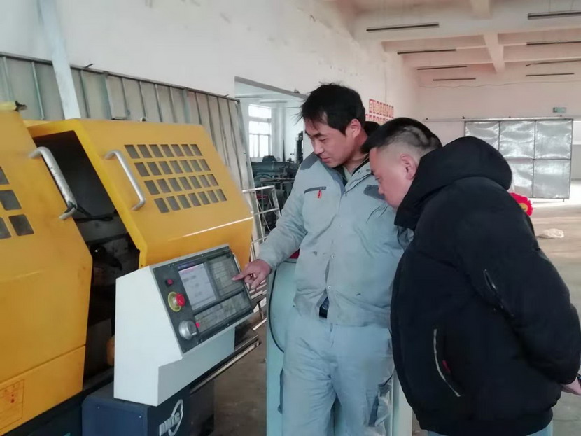 ▲2021年度星級員工-趙原塵(藍衣)指導新員工操作數控機床