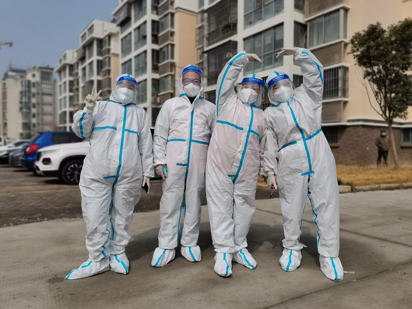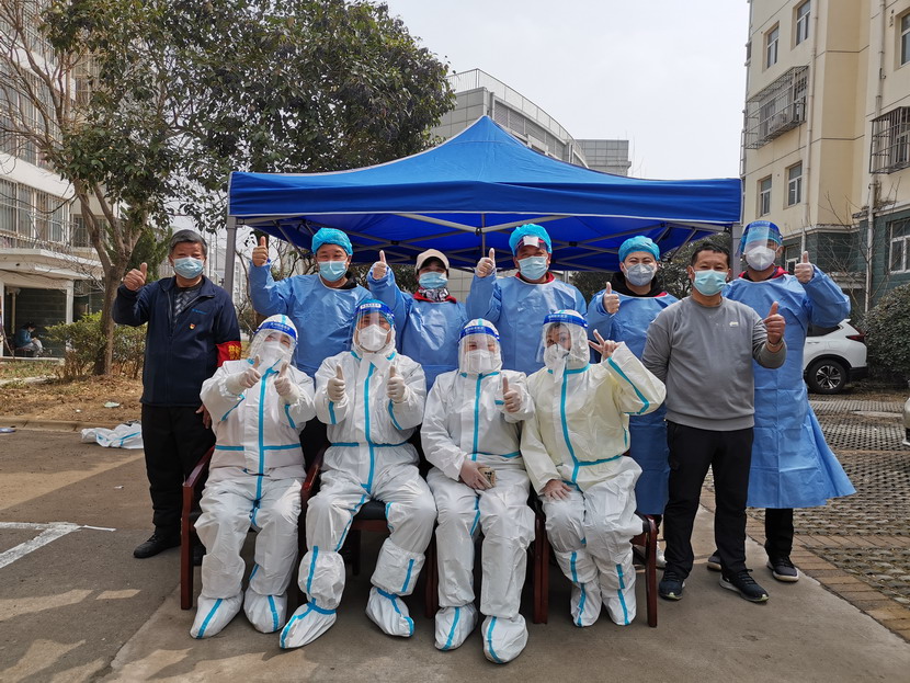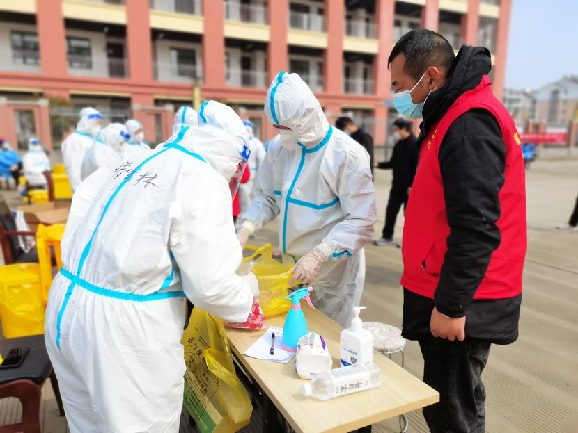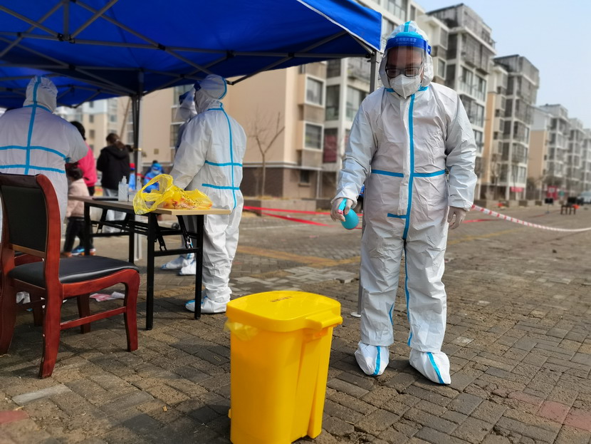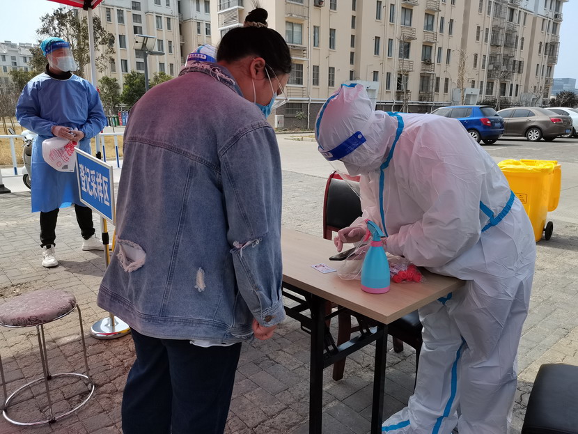 清晨6點(diǎn)30分,1號檢測點(diǎn),李明同志在檢查物資,“大白”服裝4套、“小藍”服裝6套、棉簽600根……;2號檢測點(diǎn),于洪亮在將物資上桌,病毒核酸檢測試管、棉簽、消毒液,“還缺少一瓶酒精,我立即反饋給社區,請社區抓緊安排送來(lái)”;4號檢測點(diǎn),蘇玲、秦黎明正在互相幫忙穿好防護服,“秦姐,這個(gè)防護面罩里外有兩層薄膜,我給你撕掉,這樣就不會(huì )有霧氣了”,“嗯嗯,你這個(gè)拉鏈得拉到頂,我們自己也一定要做好防護”秦黎明溫柔的說(shuō);5號檢測點(diǎn),內退黨員孫芳和姜海洋,互相在防護服后背寫(xiě)上對方的名字,以便于更高效的完成檢測工作;6號檢測點(diǎn),霍正鋼、朱文健、韓永剛、邱榮濱正在清點(diǎn)檢測小卡片;7號檢測點(diǎn),張強在拿著(zhù)酒精給廢物處置垃圾箱消毒;8號檢測點(diǎn),新加入的孫銀、占恒春、尹永明、韓永光、趙紹慶正在給消殺噴霧劑灌裝84消毒液,社區8個(gè)檢測點(diǎn)的消殺工作全部由昌圩臨時(shí)黨支部志愿者負責。