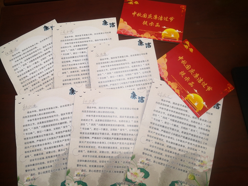 溫馨提示函早提醒。“值此中秋、國慶佳節來(lái)臨之際,臺北投資公司紀委向您和您的家人致以親切的問(wèn)候……時(shí)時(shí)警鐘長(cháng)鳴,處處廉潔自律,過(guò)一個(gè)幸福祥和的節日!”節前,公司通過(guò)廉潔提示函向黨員領(lǐng)導干部贈送節日廉潔提醒,將廉潔過(guò)節的紀律要求融入節日祝福。
