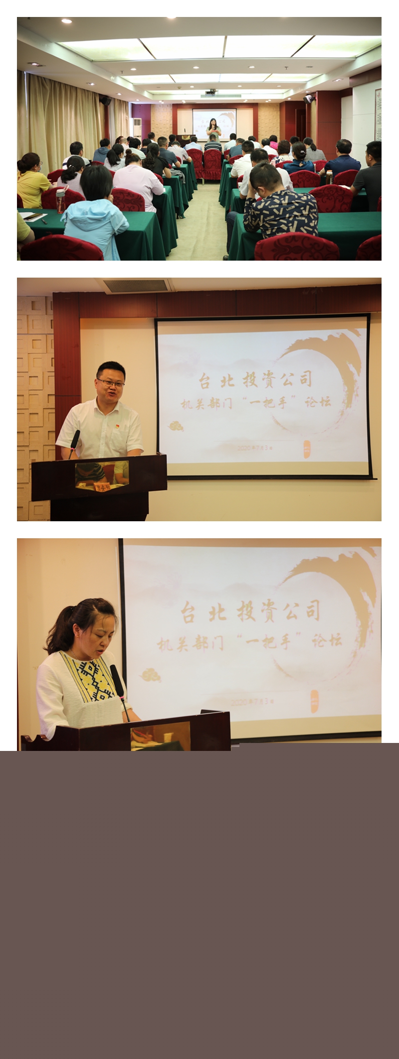 7月3日下午,投資公司在九樓會(huì )議室舉辦臺北大講壇——部門(mén)“一把手”專(zhuān)場(chǎng),來(lái)自機關(guān)部門(mén)的八位同志走上講臺,談心得,談想法,談思路,談措施。公司領(lǐng)導、各單位黨政負責人、機關(guān)部門(mén)部分人員參加了講壇。本次講壇由各基層單位主要負責人作為評委。