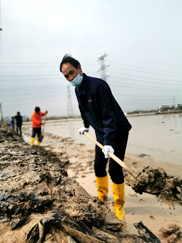 往東邊看,先鋒東灘黨旗招展分外鮮紅,海州灣公司18個(gè)單元職工、3名班組長(cháng)全員出動(dòng)馳援大浦工區協(xié)同重整410畝閑置鈣鹽灘地。引水入溝、翻泥上堰、腳踩和整、鐵掀蹋平,動(dòng)作嫻熟。1200余米的10余條池堰僅用一天的就順利完工。