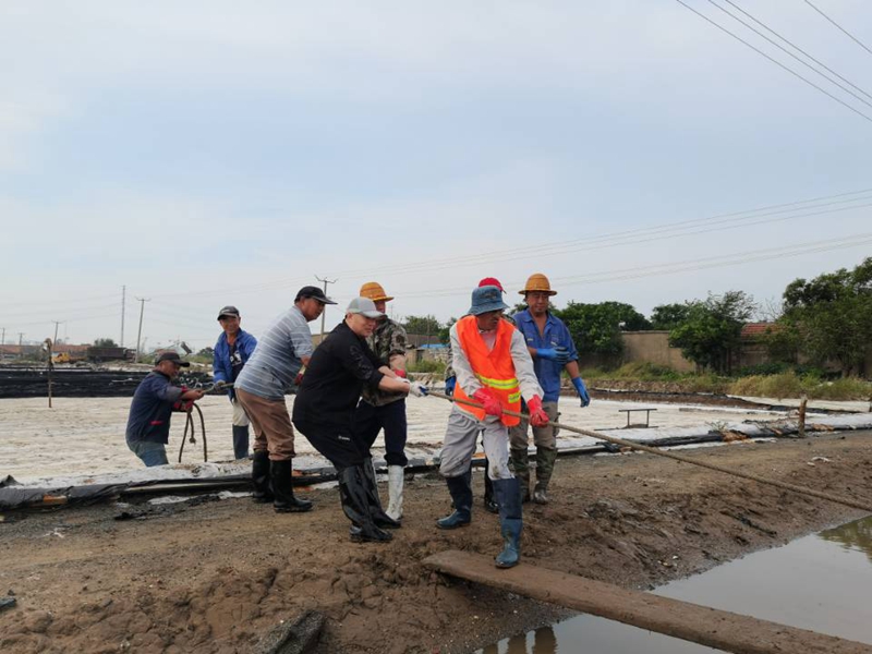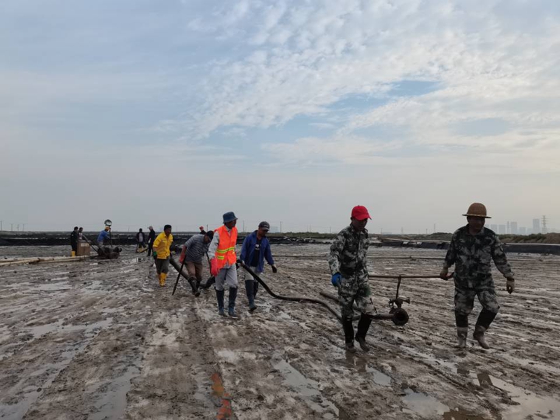 秋鹽開(kāi)扒以來(lái),海州灣公司上下所有干群,主動(dòng)放棄節假日,晝夜奮戰在鹽池里。人工扒鹽三班倒,做到人停機不停;跟班人員24小時(shí)無(wú)縫銜接,確保時(shí)刻在扒鹽現場(chǎng)做好安全監管工作。目前,隨著(zhù)堿廠(chǎng)關(guān)停的步伐加快,原鹽搶收工作進(jìn)入到了決戰階段,在公司黨委的大力支持下,兄弟單位及機關(guān)各職能部門(mén)的火速馳援下,海州灣公司迅速啟動(dòng)第二臺機械扒鹽管道,與人工扒鹽同步進(jìn)行。公司領(lǐng)導與廣大職工想在一起、干在一起,上下齊心、爭分奪秒,擼起袖子、甩開(kāi)膀子,在鹽池間盡情地揮灑著(zhù)汗水,確保勞動(dòng)成果顆粒歸倉,誓奪原鹽收官戰的勝利。